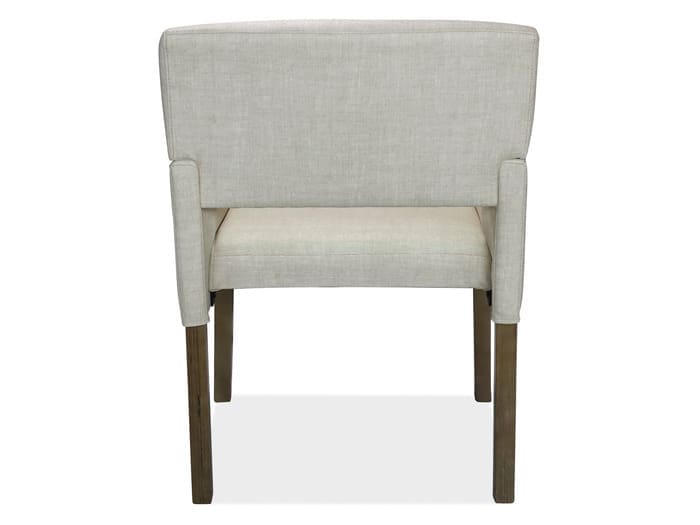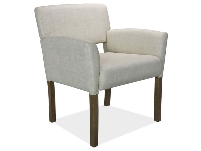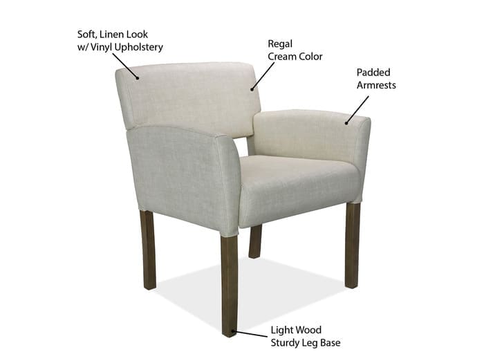 This guest chair features boxed arms and is covered in a durable, commercial-grade, linen-like cream vinyl for enhanced durability. Its modern design includes an exposed back cushion, aiding in the prevention of heat and moisture accumulation.